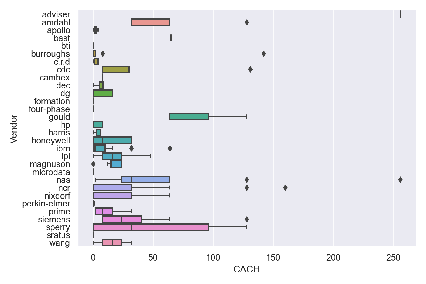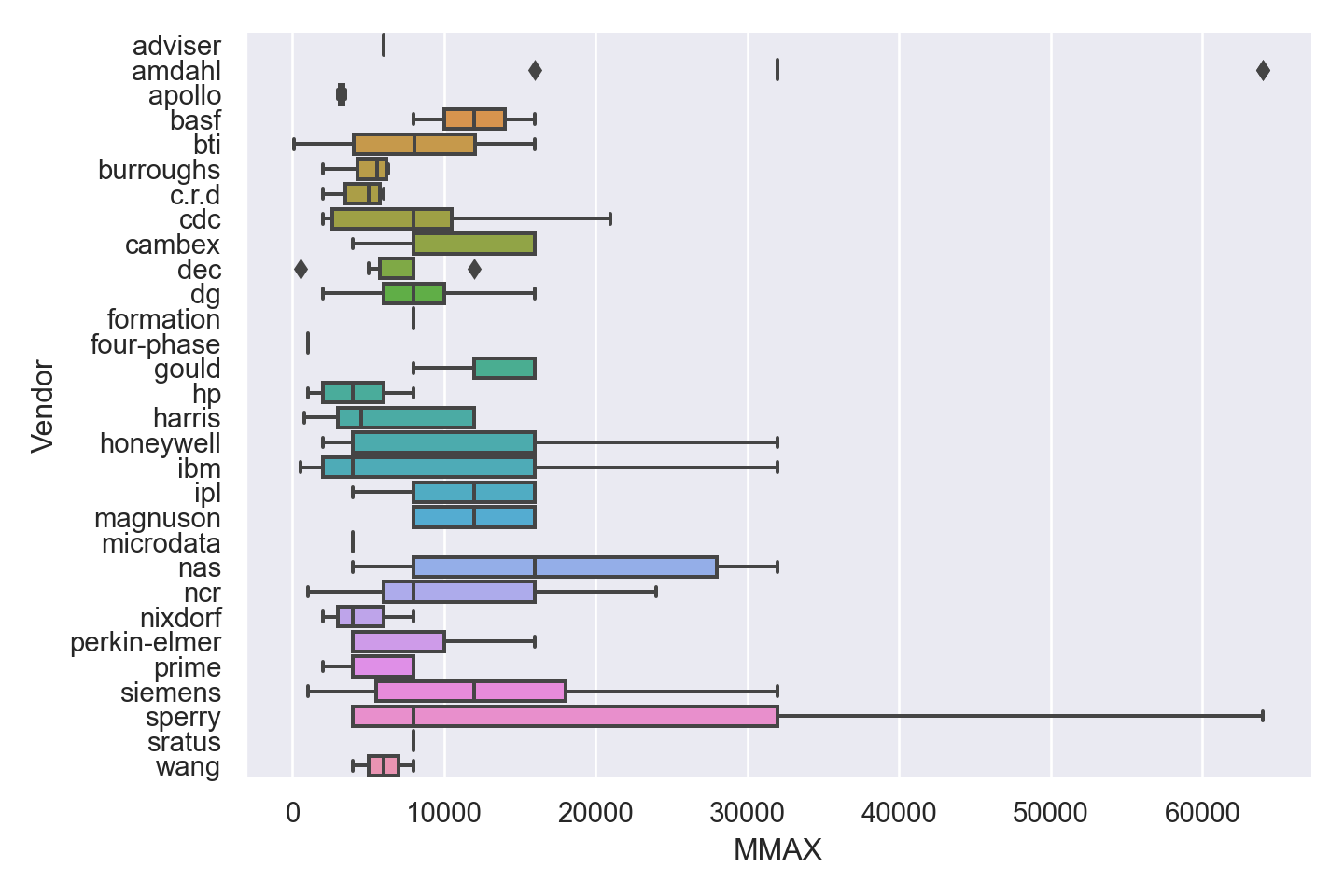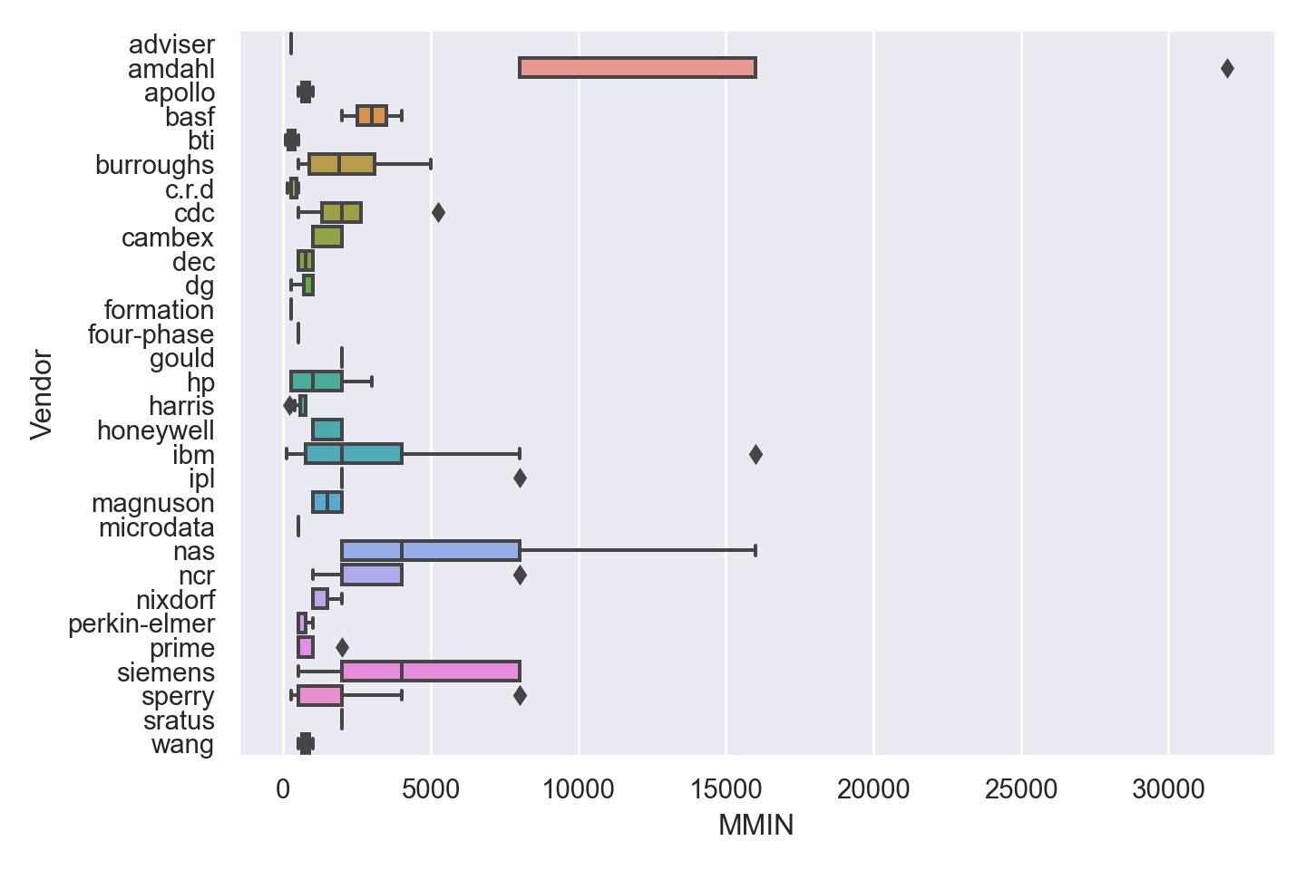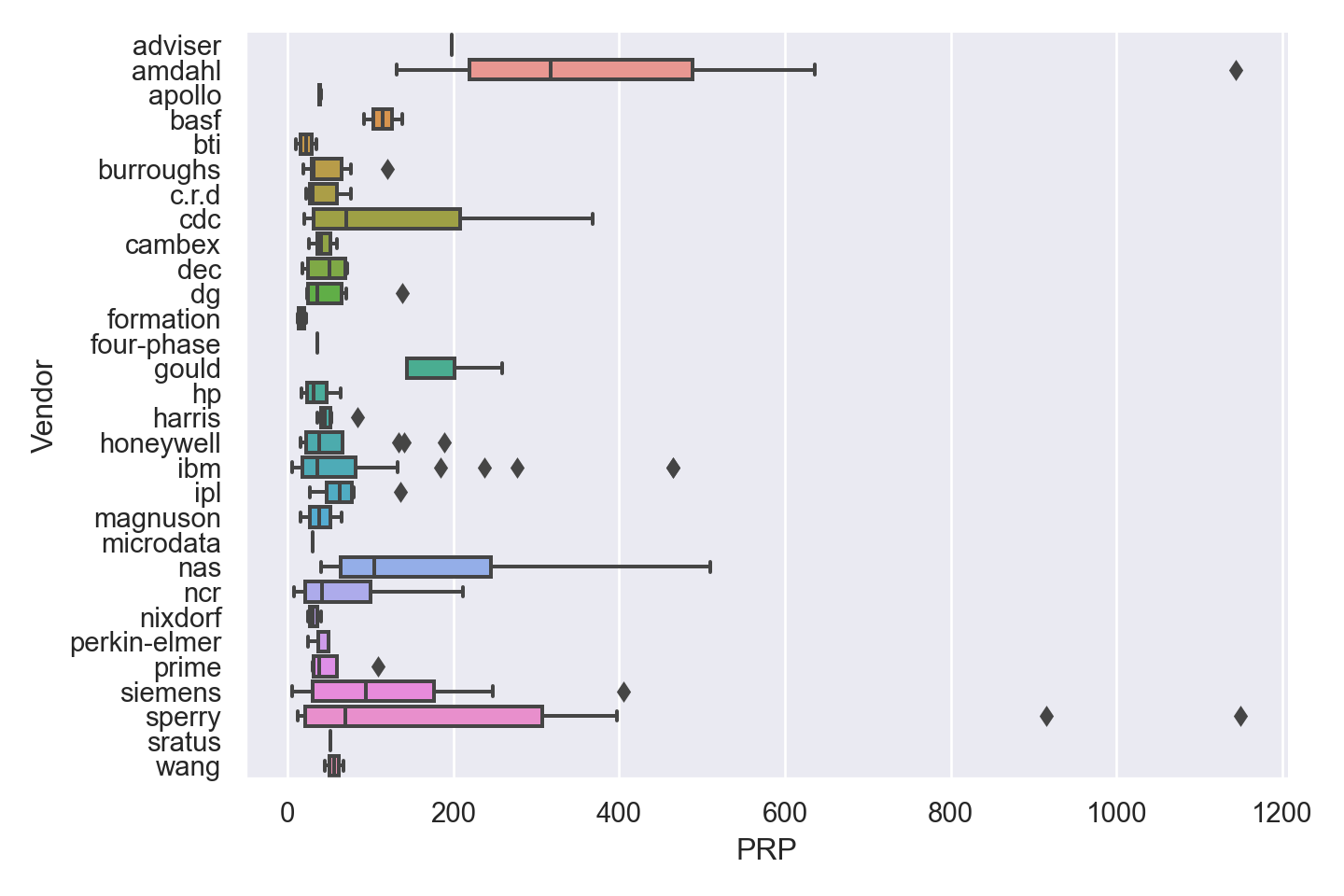 dsp.Markdown(sample.to_markdown(index=False))| Vendor | Model | MYCT | MMIN | MMAX | CACH | CHMIN | CHMAX | PRP | ERP |
