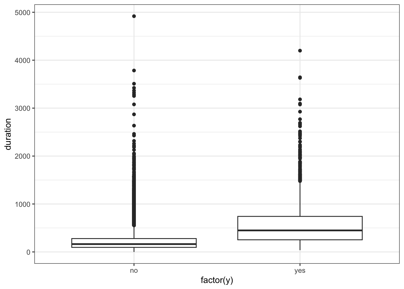 | duration | numeric | last contact duration in seconds. The duration is not known before the call, so even though this has a strong impact on outcome (duration=0 => y=0), it should be discarded from the model |