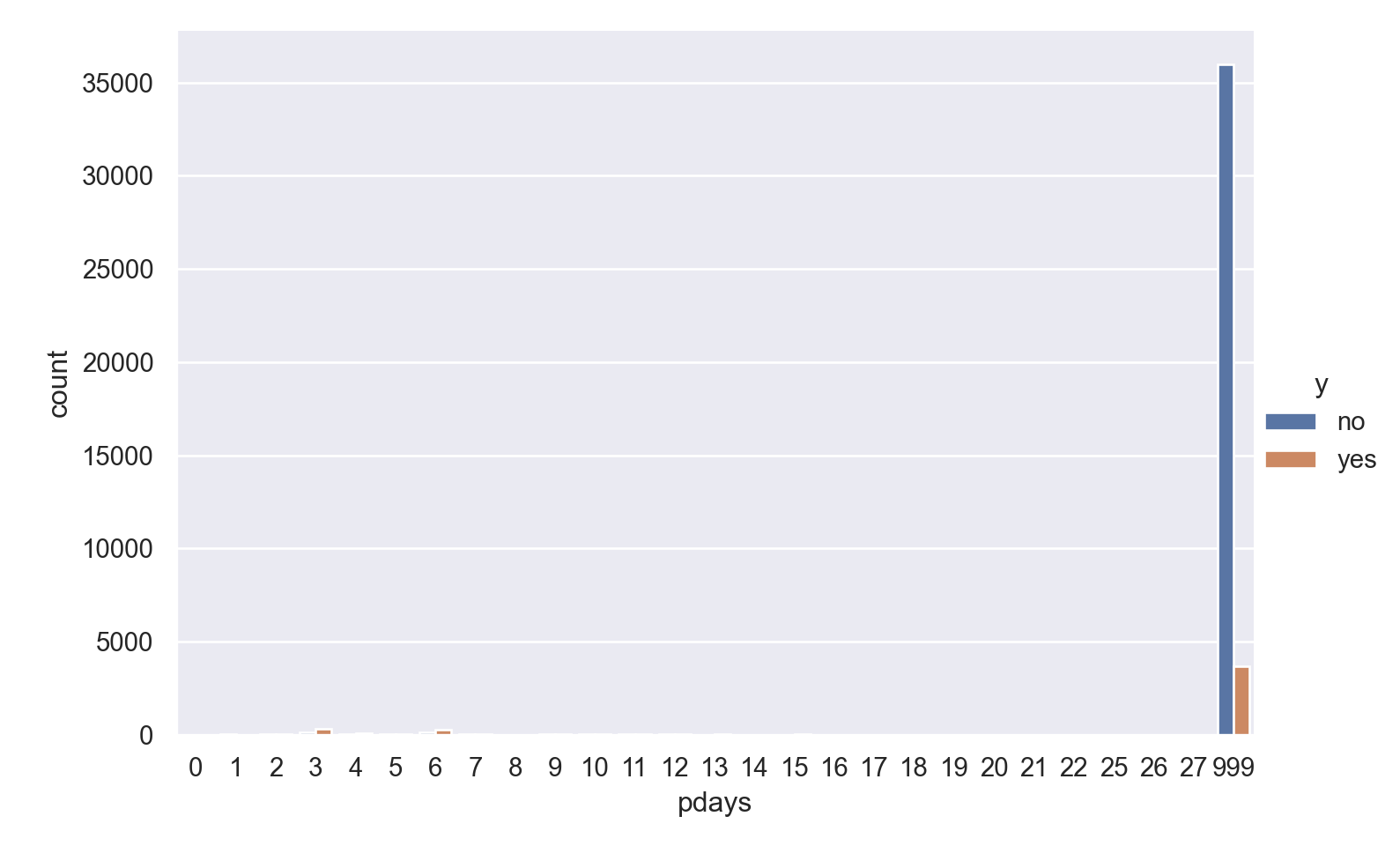 | pdays | numeric | number of days passed since client was contacted since the client was last contacted from a previous campaign. 999 means not previously contacted |