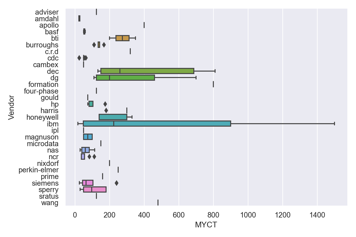 dsp.Markdown(sample.to_markdown(index=False))| Vendor | Model | MYCT | MMIN | MMAX | CACH | CHMIN | CHMAX | PRP | ERP |
